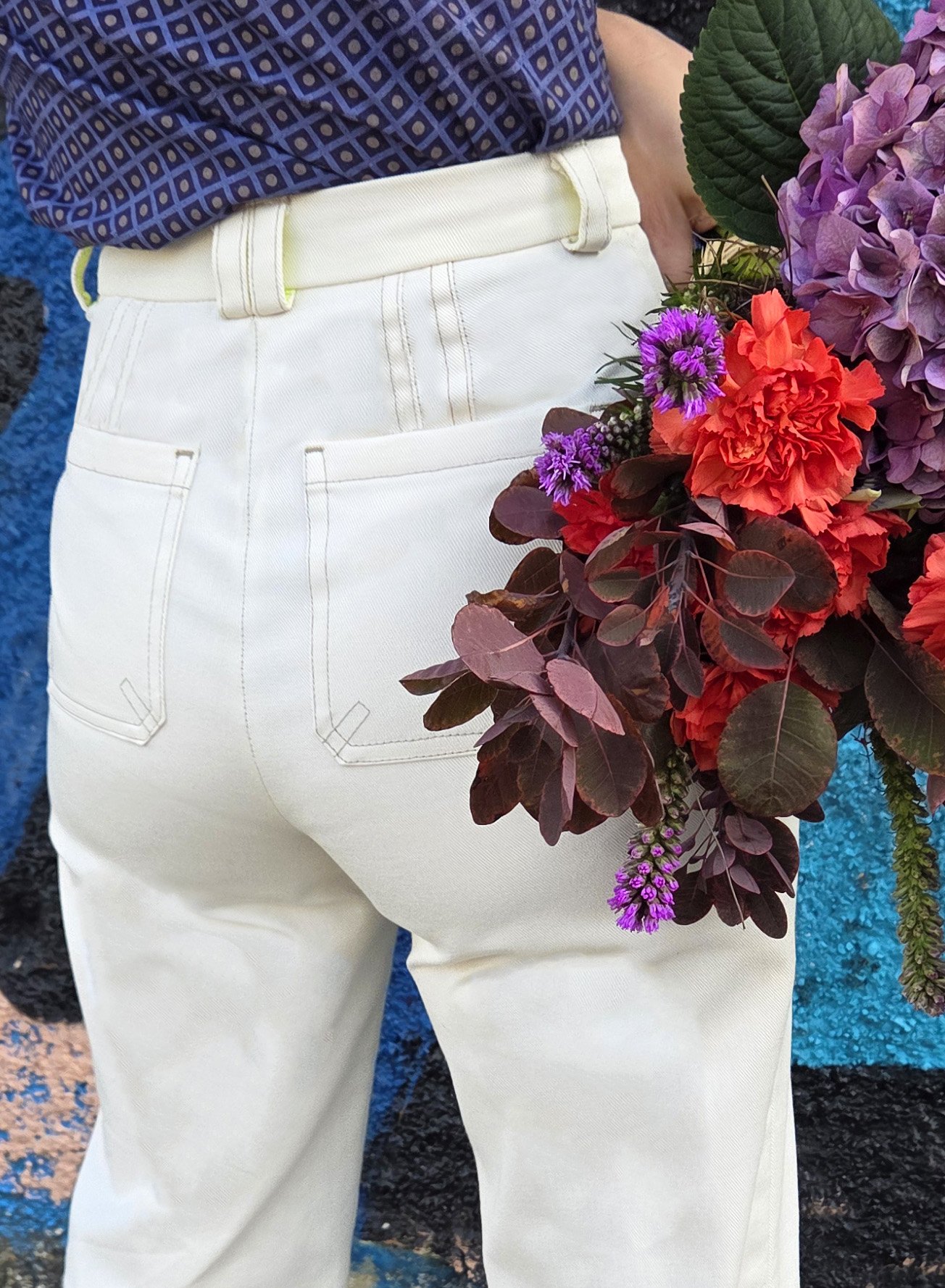 Wilde ose la coupe wide avec élégance et caractère. Ses 4 poches plaquées dessinent une silhouette structurée, tandis que ses pinces au dos sculptent le tombé. La ceinture, soulignée par un jeu de passants, apporte une touche de raffinement. Un modèle pensé pour danser entre les matières et les styles.