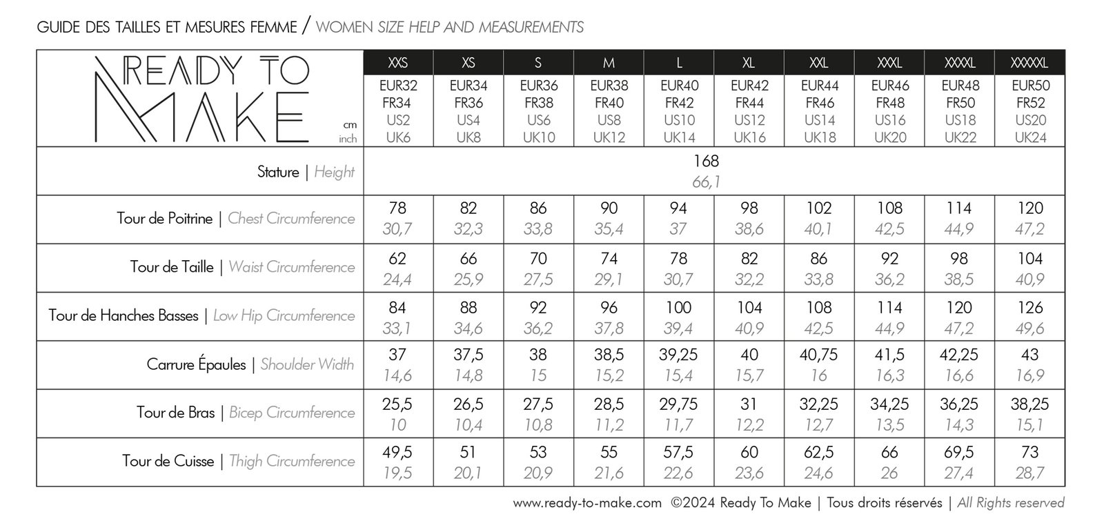 - Version robe manches 3/4 (ou courtes) + volant : 2XS à S : 200cm – S+ à M+ 260cm – L à 2XL : 320cm